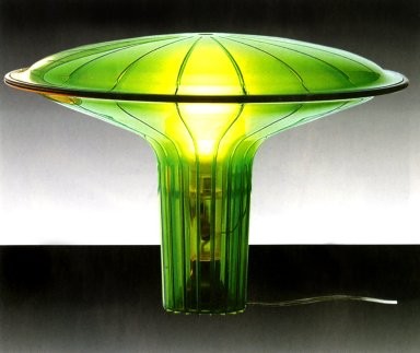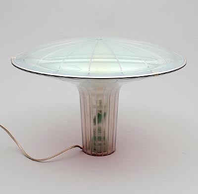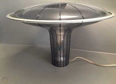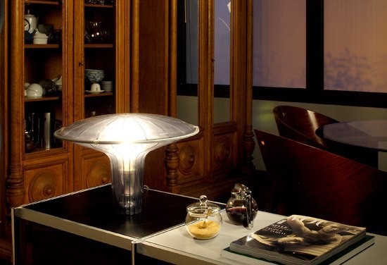 Lampada da tavolo in policarbonato fumé, trasparente o verde con dettagli in alluminio.