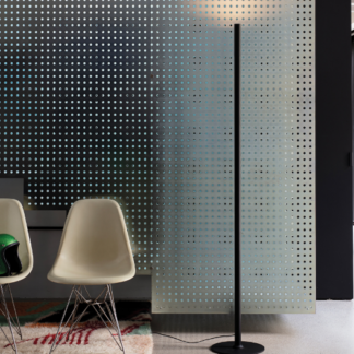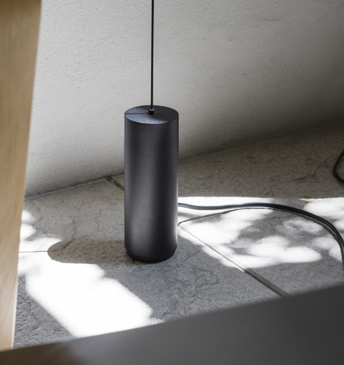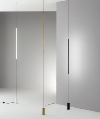 Filo sospensione/terra con rosone, corpo luce e base a terra in metallo verniciato a polveri o placcato. Diffusore in PC opale satinato. Cavo di sostegno in PVC nero.
